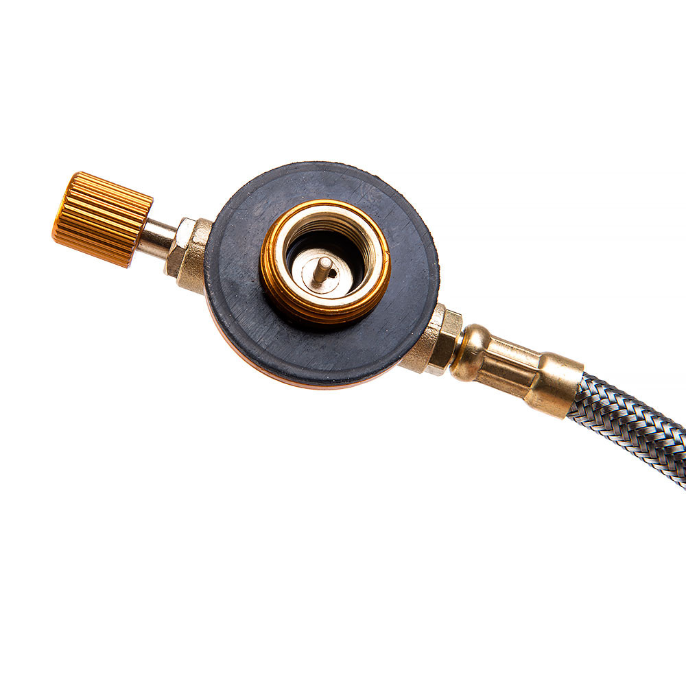 Este fogareiro apresenta um diferencial, pois ele não é montado sobre o botijão de gás. Ele apresenta uma mangueira de gás ligada ao cartucho pela porta de conexão, que fica separado do fogareiro, facilitando o manuseio da panela grandes e alimentos. Desta forma ele é mais estável, evitando que sua panela caia quando você está cozinhando.