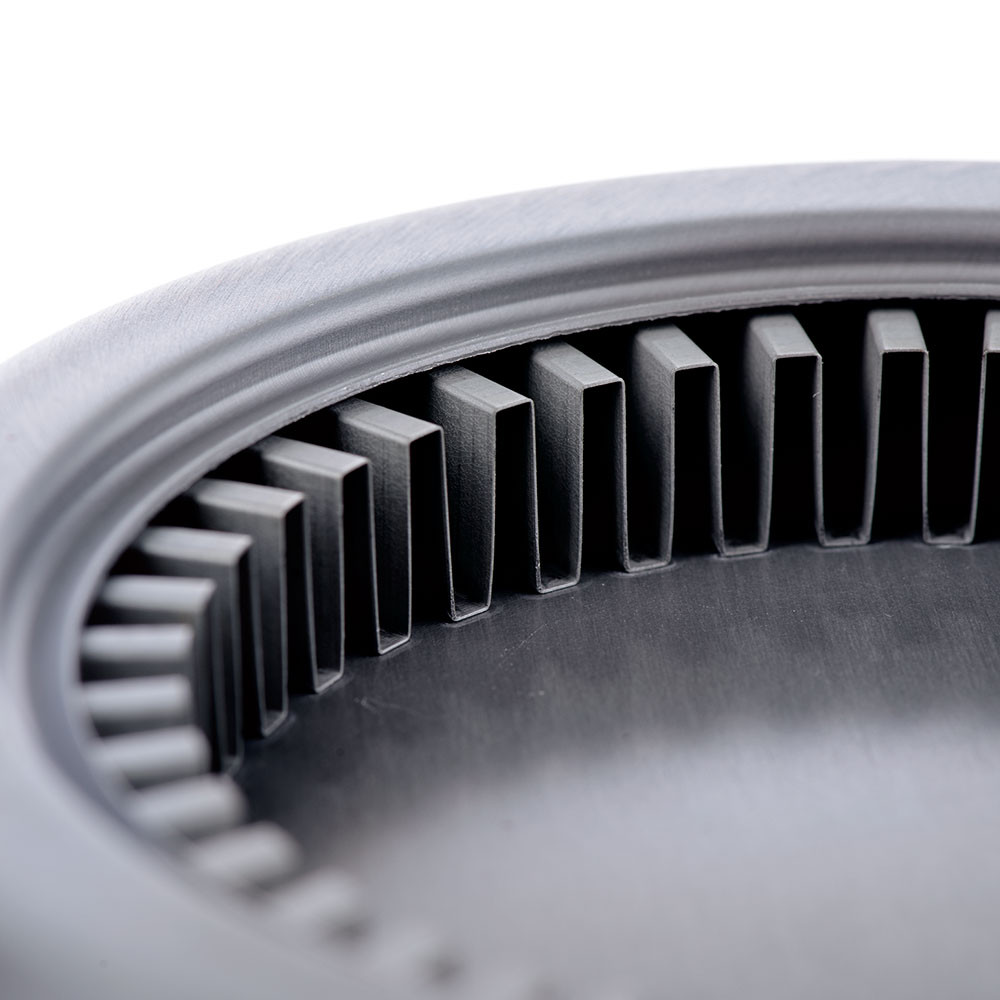 Pois foi exatamente o que foi feito. O fundo e parte da lateral são ocos, com pequenas células que retém o calor gerado, transferindo este para o interior da panela. Economize gás de fogareiro e tempo!
